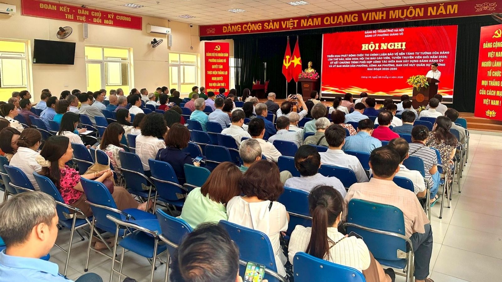 Đảng ủy phường Giảng Võ, TP. Hà Nội đã tổ chức Hội nghị phát động Cuộc thi chính luận về bảo vệ nền tảng tư tưởng của Đảng lần thứ Sáu, năm 2026 và triển khai Hội thi Báo cáo viên, Tuyên truyền viên giỏi. Đây là hoạt động trọng tâm trong công tác tư tưởng, góp phần nâng cao chất lượng tuyên truyền, củng cố niềm tin và sự thống nhất trong toàn Đảng bộ, đáp ứng yêu cầu phát triển trong giai đoạn mới.
